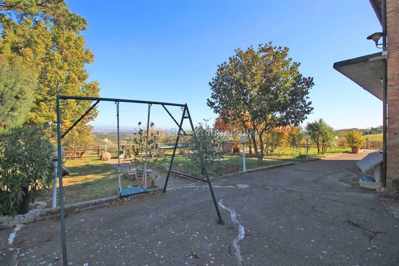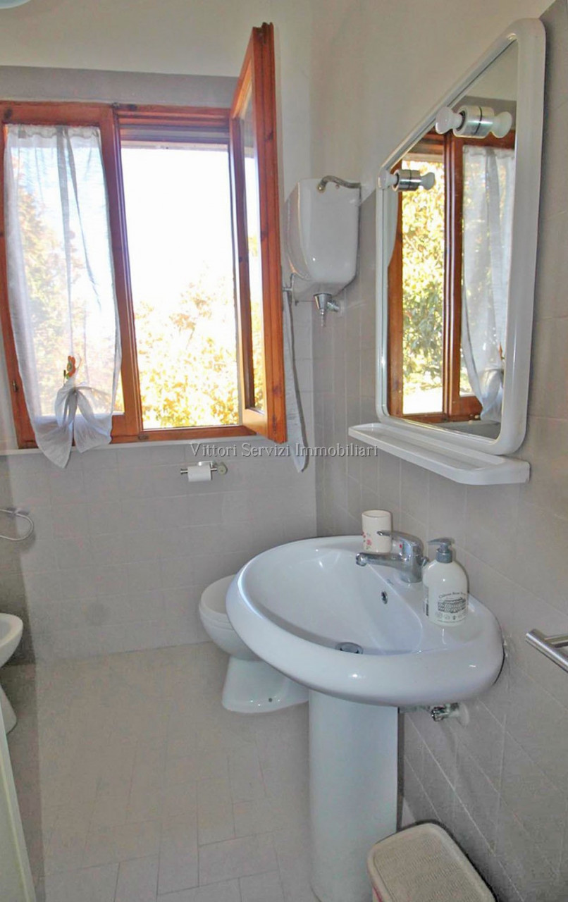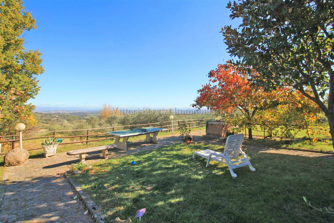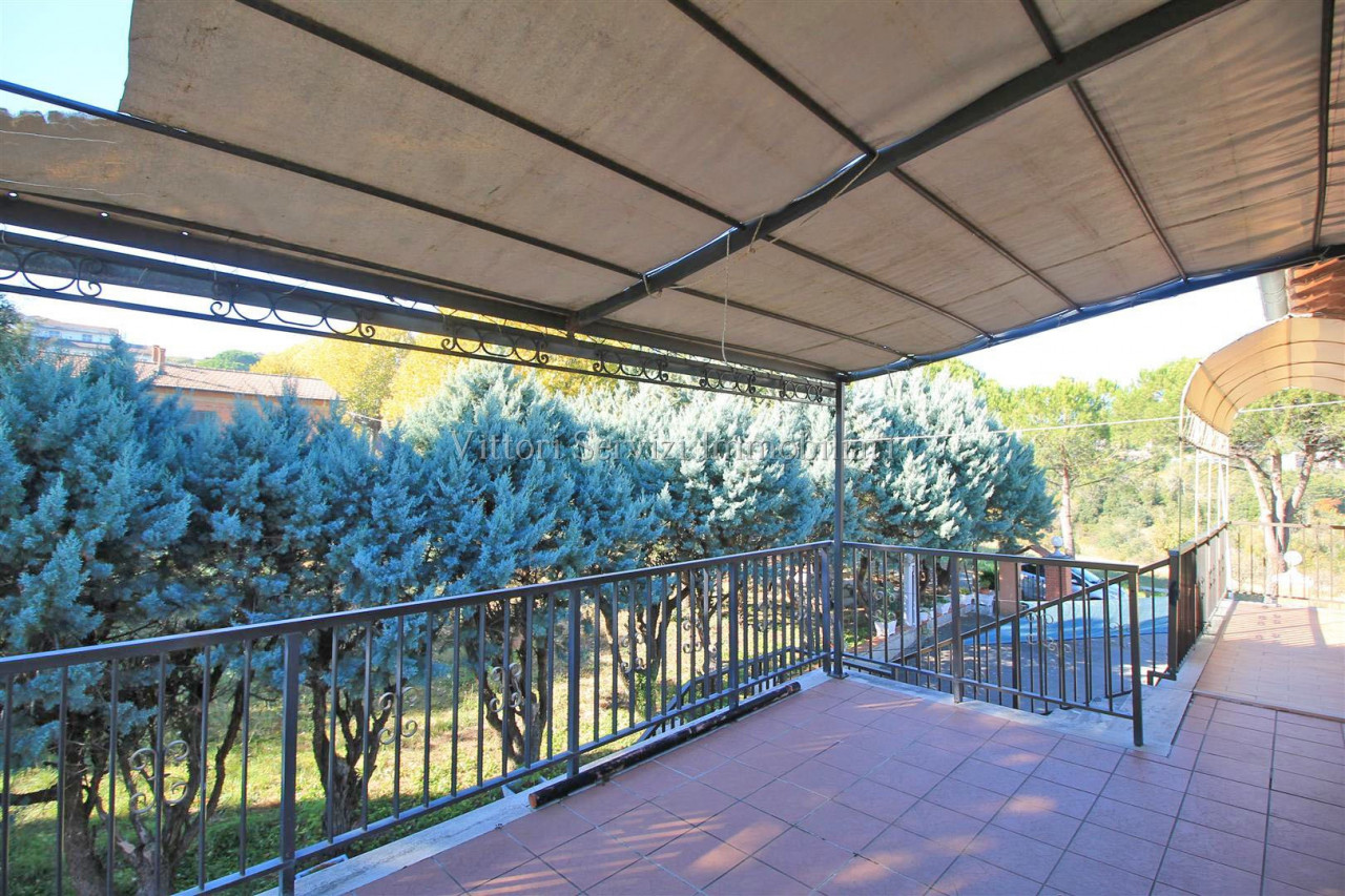 In zona collinare, con bella vista panoramica, si propone la vendita di villa di complessivi mq. 370 con giardino privato ed uliveto di complessivi mq. 2500. La proprietà si compone al piano terreno di: A) Bilocale di mq. 48 con soggiorno con cucinotto, camera e bagno finestrato con doccia. B) Trilocale di mq. 72 con soggiorno con angolo cottura, due camere matrimoniali, bagno finestrato con doccia e ripostiglio. Entrambe le unità sono state oggetto di ristrutturazione nel 2010. Al piano primo troviamo ulteriore appartamento di mq. 126, da recuperare, composto di ampio soggiorno e cucina con affaccio su terrazza abitabile, due camere matrimoniali, camera singola con bagno privato, bagno principale finestrato con doccia e studio. Completa la proprietà locali ad uso magazzino al piano seminterrato di mq. 100 e locali accessori (vano tecnico e monolocale) di mq. 24 al piano terreno. Contesto tranquillo immerso nel verde a breve distanza dai principali servizi.